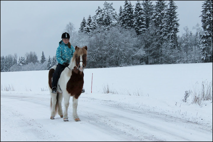 Kun vihdoin pääsimme pienelle tasaiselle pätkälle aloin tölttäillä hiukan edestakaisin tietä. Immy kipitti oikein kivasti ja selkä liikkui hyvin, välillä jouduin kuitenkin ottamaan hyvinkin jämäkästi ponia suusta että jarrut löytyisivät.Kun töltit oli tölttäilty aloin pyytämään ravia. Alussa menimme Immyn kanssa hirmuista vauhtia einkä saanut mitenkään päin Immyä tuntumalle. En olisi halunnut nähdä tutota meidän menoa yhtään sillä se tuntui aivan karmealle sähellykselle.:D